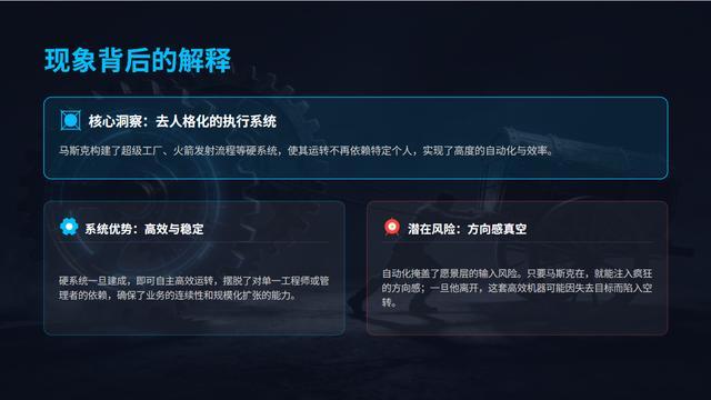 但这是一种错觉。硬系统的自动化运转,掩盖了愿景层输入的真空风险。只要马斯克还在,他就能源源不断地向系统注入疯狂的方向感;一旦输入源切断,这套高效的机器可能会因为不知道往哪去而陷入空转,或者被保守的职业经理人导向平庸。