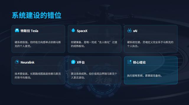 这说明马斯克成功构建了“去人格化的执行系统”。超级工厂、火箭发射流程、自动驾驶数据闭环——这些硬系统一旦建成,确实不再依赖特定的工程师个人。