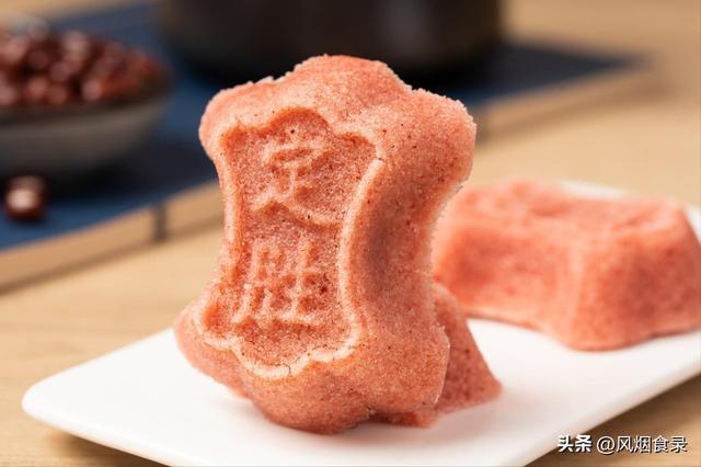 粳米粉和糯米粉按6:4的黄金比例兑好,加红曲粉染成喜庆的粉红色,再拌上糖桂花,填进梨木模具,中间裹上豆沙馅,旺火蒸20分钟。